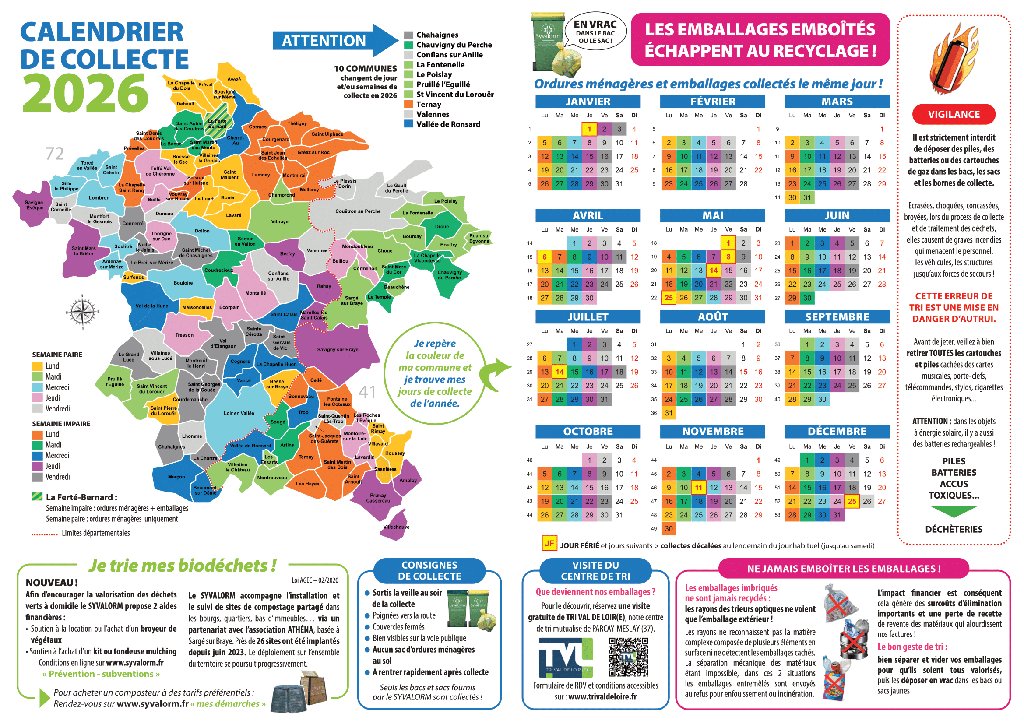 Retrouvez le calendrier des horaires de déchèteries du Syvalorm sur 2026 et les jours de ramassage des ordures ménagères sur chaque commune du territoire.
